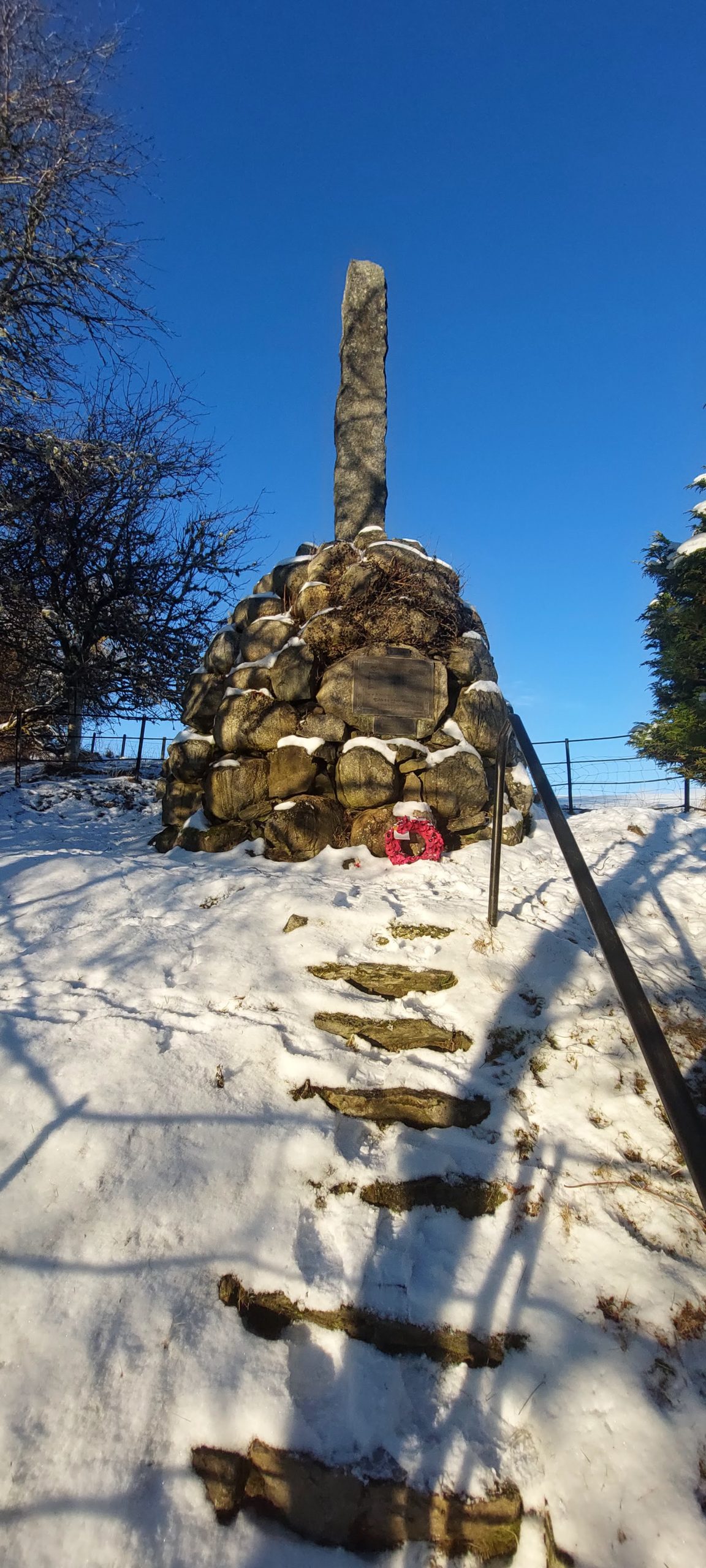 Stone Cairn with a Brass Plaque for WW1 engraved in Celtic lettering, with a Celtic cross in the centre, and a Celtic scroll round the margin (and a supplementary WW1 Brass Plaque below) and a separate brass Plaque for WW1 below that. The form of a cairn was thought to be the most appropriate to the district and to the men who gave their lives, and as being the traditional Scottish memorial to a warrior who fell in battle. The cairn built of boulders off the land on which the fallen lived and worked, and was put up by the hands of the people themselves. To gather in the stones three love dargs were held during the spring and summer, these being heartily supported by everyone who was asked to help. The boulders, some of them of considerable size, are cemented together, and form a pile 11 feet high, surmounted by an immense slab of stone 13 feet high, two feet of which is imbedded in the centre of the cairn. This huge block was brought from Kindrogan. The actual height of the monument is thus 22 feet. Notice the huge difference between the 2006 (and the 2013 images on the 'Mount Blair' reference) and the 2015 images on this report.