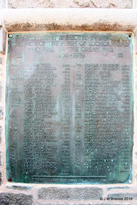 Corner Stones- MESOPOTAMIA/THE OCEAN/YPRES/MONS/BEAUMONT-HAMEL/GALLIPOLI WW1 Plaque-THIS MONUMENT IS ERECTED IN MEMORY OF/THE MEN OF THE PARISH OF LOCHGILPHEAD/WHO FELL IN THE GREAT WAR 1914-1919/[names] WW2 Plaque-THESE ADDED STONES/ARE RAISED/TO COMMEMORATE/THE MEN OF OUR/TOWN WHO GAVE/THEIR LIVES IN/THE WORLD WAR/1939-1945/MARION AD AIHM/GU SUTHAIN SIOR/[names on two other plaques]