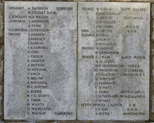 THEIR NAME LIVETH FOREVER MORE/ TO THE / GLORY OF GOD / AND IN PROUD / AND GRATEFUL / MEMORY / OF THE MEN / FROM THE PARISH OF / NEW DEER / WHO MADE THE / SUPREME SACRIFICE / IN THE WARS / 1914-1919 / AND / 1939-1945 / (NAMES)