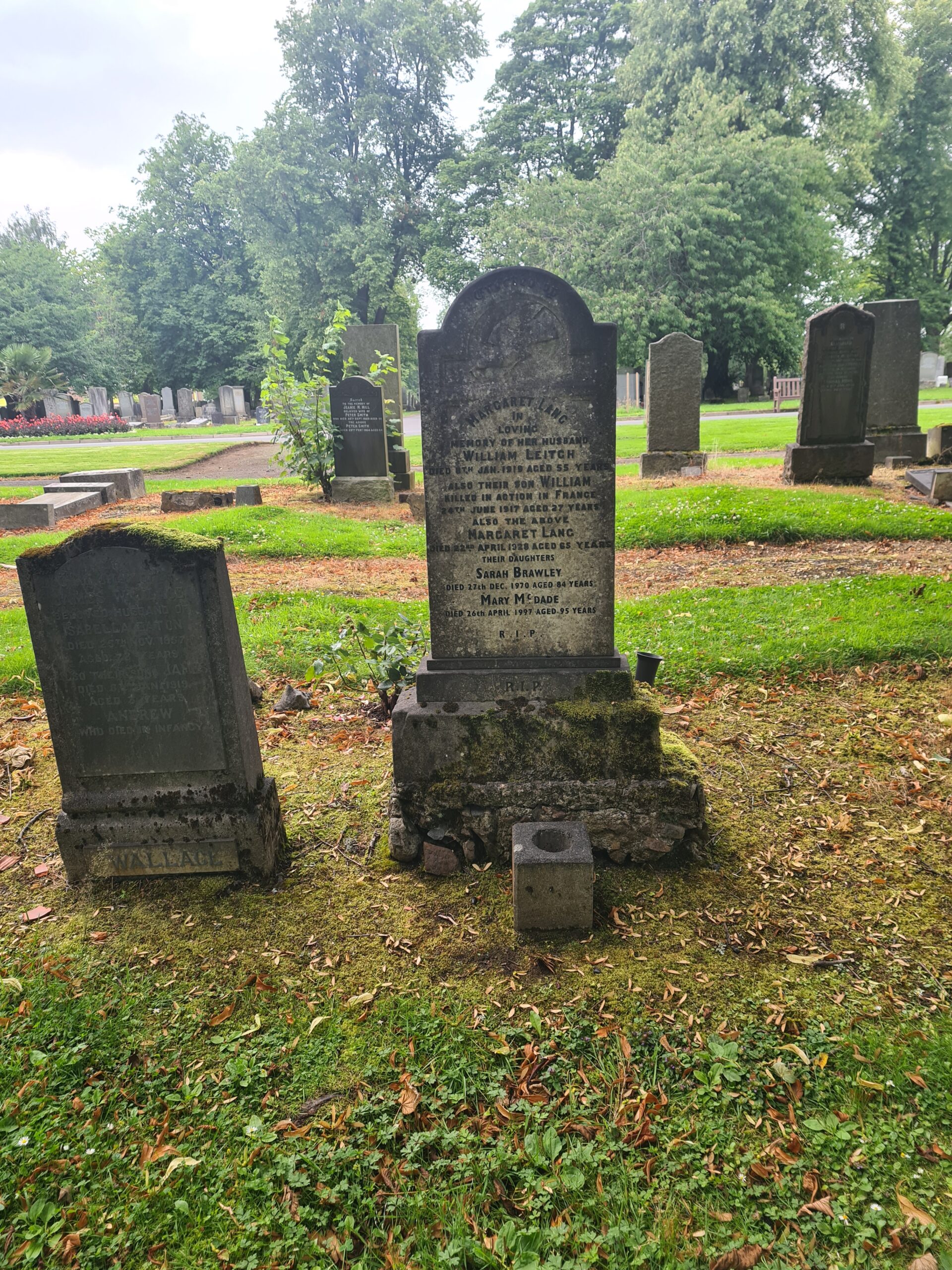 Commemorated on a Gravestone at Hawkhead cemetery, Paisley. A section No. 913 (what3words: bronze.select.exam)